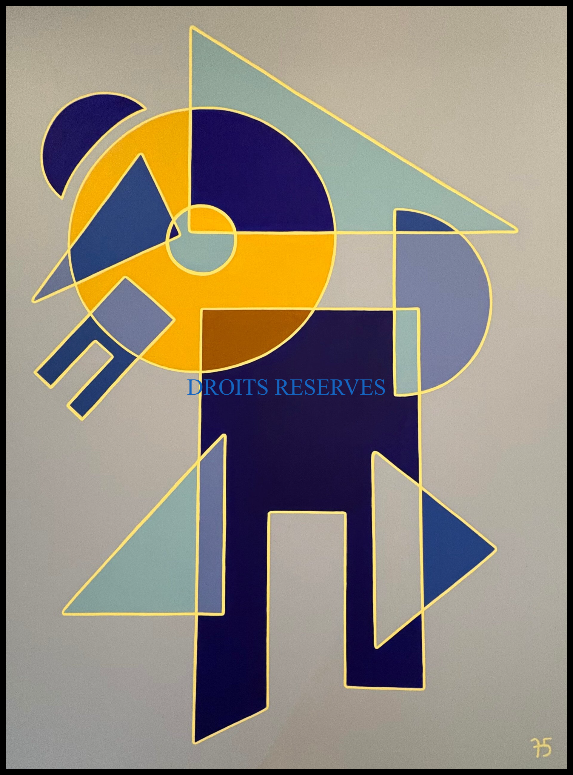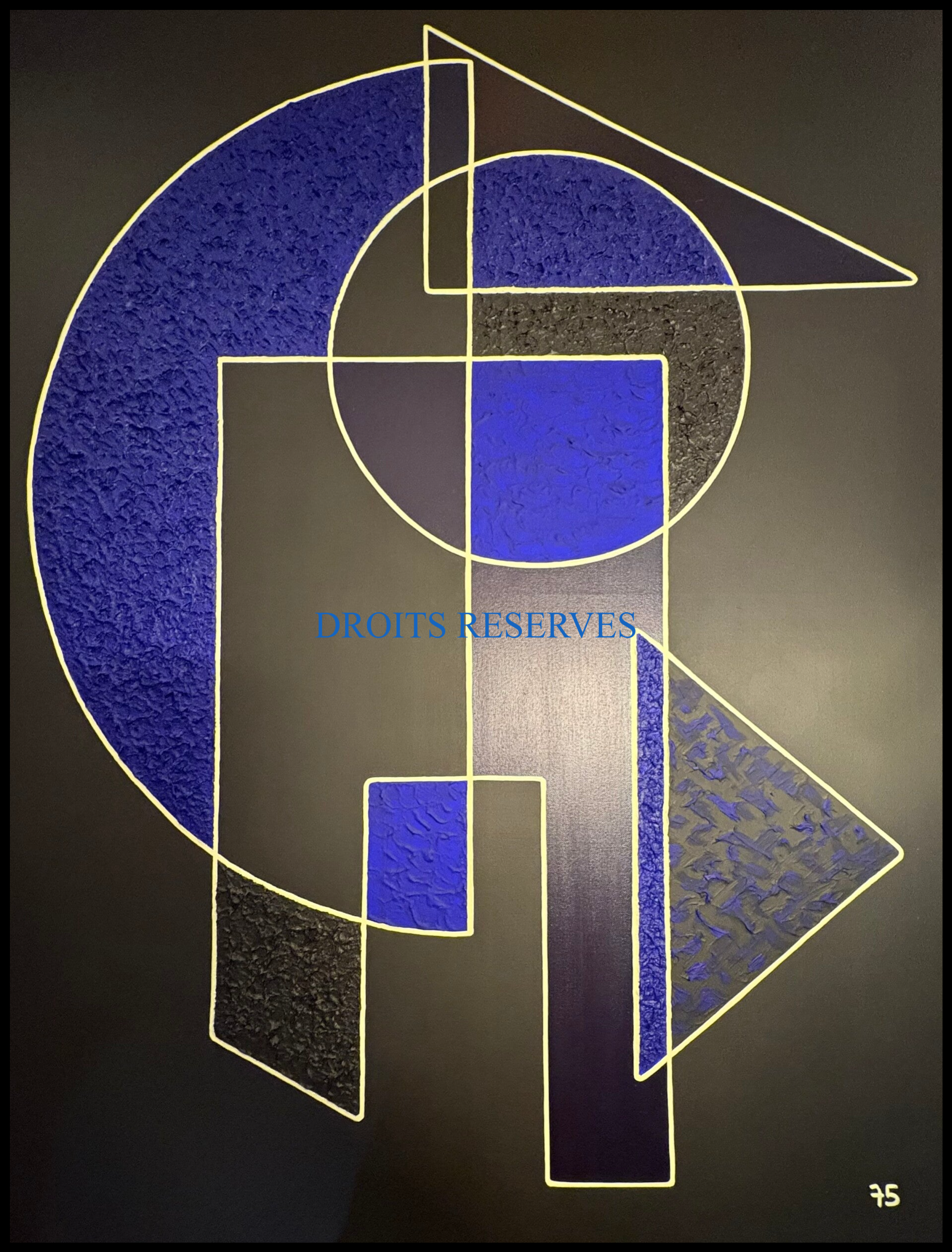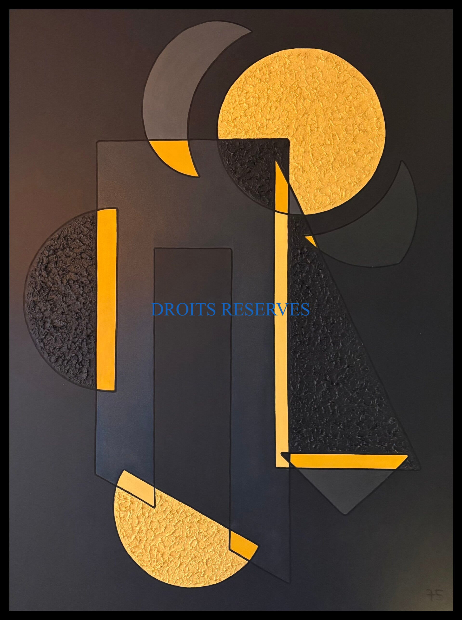 Ge75 présente des peintures abstraites réalisées principalement à l’acrylique sur toile, disponibles en plusieurs tailles. Ces œuvres ne représentent pas des objets ou des scènes reconnaissables, mais jouent avec les formes, les couleurs et les espaces pour créer une ambiance et faire ressentir des émotions.L’artiste s’inscrit dans un style appelé rétro-moderne, où le but est d’inviter le regardeur à vivre une expérience visuelle unique, plutôt que de raconter une histoire précise. Chaque tableau offre un terrain de découverte personnelle, où chacun peut laisser libre cours à son imagination et à ses sentiments.